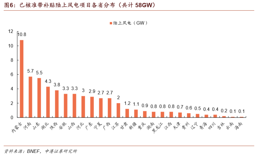 內(nèi)蒙古脫離紅色預(yù)警區(qū)后,大量項目被釋放,待建帶補貼項目達(dá)10.8GW。河南、山東待建項目同樣分別高達(dá)5.7GW、5.5GW,體現(xiàn)出風(fēng)電項目建設(shè)重點逐漸從三北地區(qū)向中東南地區(qū)轉(zhuǎn)移的特點。