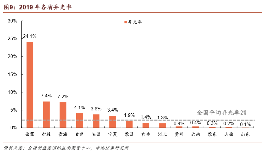 2019年我國棄風(fēng)、棄光率實現(xiàn)雙降,消納形勢繼續(xù)改善。全國平均棄光率為2%,同比下降1 pct。棄光率高于全國平均水平的省份有西藏(24.1%)、新疆(7.4%)、青海(7.2%)、甘肅(4.1%)、陜西(3.8%)、寧夏(3.4%),集中在我國西北地區(qū)。同期全國平均棄風(fēng)率為4%,同比下降3 pct。棄風(fēng)率高于全國平均水平的省份/地區(qū)有新疆(14%)、蒙西(9%)、甘肅(7.6%)、河北(4.8%