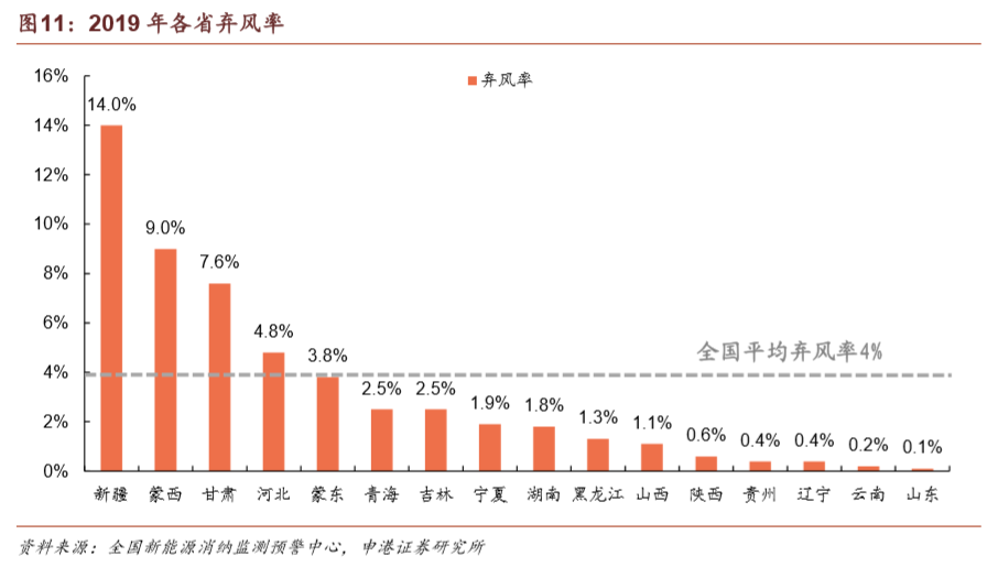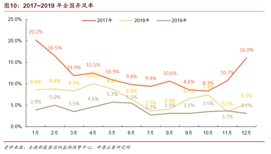 上一輪搶裝期過后,風(fēng)電場的并網(wǎng)需求遠(yuǎn)高于電網(wǎng)的消納能力,導(dǎo)致棄風(fēng)率在2016年達(dá)到高點。在風(fēng)電投資預(yù)警監(jiān)測機制的限制下,諸多已核準(zhǔn)項目陷入冷凍期。在經(jīng)歷了2015年15%、2016年17.1%的棄風(fēng)率高峰之后,棄風(fēng)率已連續(xù)三年實現(xiàn)下降,2019年實現(xiàn)棄風(fēng)率4%,同比降低3 pct,繼續(xù)保持即可滿足2020年棄風(fēng)率要求。