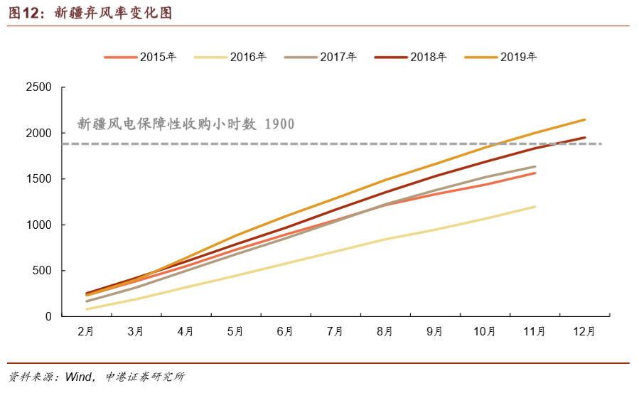 新疆有望于2020年脫離紅色區(qū)域,釋放風(fēng)電裝機需求。2019年新疆棄風(fēng)電量棄風(fēng)率14%,同比下降了9 pct,全年實現(xiàn)利用小時數(shù)2147小時,高于最低保障性收購小時數(shù)1900,因此2020年新疆有望退出紅色預(yù)警區(qū)域,釋放新增裝機需求。而甘肅雖然2019年棄風(fēng)率只有7.6%,但全年利用小時數(shù)1787小時,低于最低保障性小時數(shù)1800小時的要求,預(yù)計仍將位列紅色預(yù)警區(qū)域,不能進(jìn)行風(fēng)電項目建設(shè)。